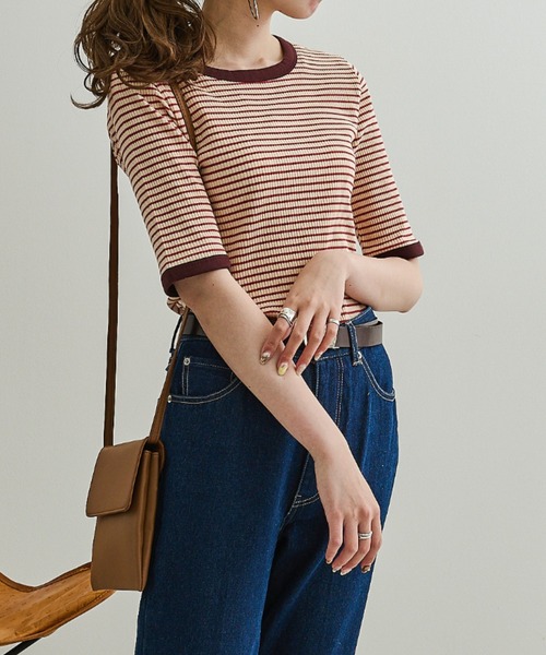 コーディネートの一アクセントに◎ 細ボーダーとコンパクトなサイズ感で華奢見えに。 すっきりとした丈感でロングボトムとのバランス感も◎ 落ち着いたカラーで大人の女性にも素敵に着て頂けます。 ■point ・襟ぐりと袖口が少し太めボーダーでメリハリ ・コンパクトながらも程よいゆとり ・柔らかいカラー展開 ・肘あたりまである半端袖 ■detail 少し長めの半袖で、二の腕もさりげなくカバー出来るのも、嬉しいポイントです。 ■fabric 吸収性、通気性に優れた心地よい風合い。 …………………… 透け感:なし 厚さ:普通 伸縮性:あり …………………… ■coordinate コンパクトなシルエットを生かして、ゆったりめなボトムもちろん ロングスカートなどのフェミニンアイテムとも相性抜群。 デニムやスキニ―パンツ、スカートなど、 どんなボトムとも合わせやすいカットソー。 ※ご注意※ ・屋外の光や照明の当たり具合で、実際の商品の色味とカラー別画像の色味に若干の違いが発生する場合がございます。 ・詳細画像と併せてご確認の上、ご注文いただきますようお願い致します。 ※サイトに表示されているカラー名と実際のお届け商品に記載されているカラー名が異なる場合がございます。 ●お買い物をお得によりお楽しみいただく為に● ▼商品のお気に入り登録&ブランドお気に入り登録▼ がおすすめです! ♡をクリック 完売カラーの再入荷通知や、ラスト1点の通知、プライスダウンしたセール通知も受け取ることができます。 ブランドお気に入り登録もご一緒にお願い致します。 #ニュアンスカラー#ピタT#淡色#淡いカラー#チェック