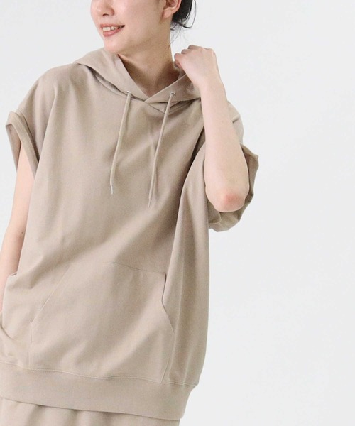 スカートとセットアップで着られるノースリーブパーカー ミニ裏毛の素材を使用しているので、着心地が良いです。 フレンチスリーブなので、二の腕が少し隠れるシルエットかつ、着丈も長めなのでで安心して着用いただけます。