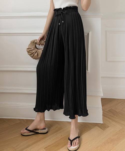 【商品説明】 大人かわいいプリーツワイドパンツ 流れるような落ち感が女性らしいシルエットを演出してくれるプリーツパンツ。 程よくルーズなシルエットが抜け感を演出してくれる、こなれ感たっぷりの1枚。 薄手でさらりとした履き心地で、リラックスにもぴったりなアイテムです。 ※透け感のある商品となっておりますので、インナーの着用をおすすめいたします。 ◇コーディネート◇ サマーニットやカジュアルなカットソーなど、コンパクトなトップスと合わせるとバランスの良いこなれコーデに。 ワンピースやロング丈トップスとのレイヤードスタイルもおすすめです。 【詳細】 ◇伸縮性…なし/◇裏地…なし ◇透け感…あり/◇ファスナー…なし ◇ポケット…なし/◇ボタン…なし ◇生地感…さらっとした薄手の生地です。 ◇ウエストゴムです。 ◇国内で検品済みです。