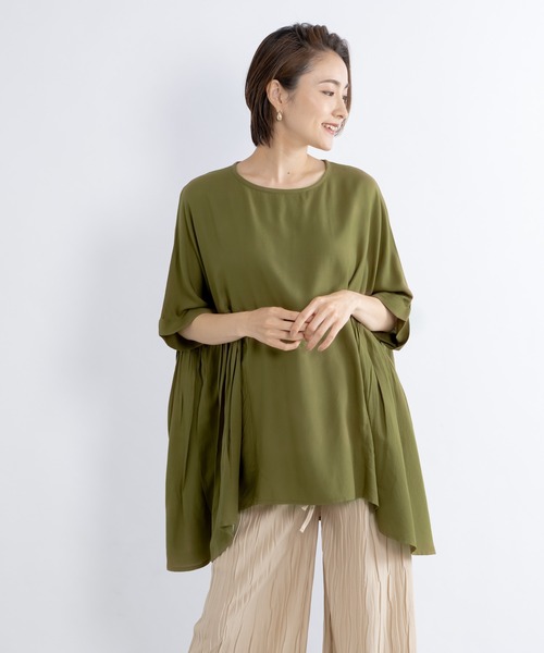 【KATHARINE ROSSセレクト】かろやかな素材とデザインが夏らしいロング丈チュニックブラウス。 サイドのたっぷりギャザーが華やか見えしてくれ、また風通しよく涼しく着れます。 ラウンドスリットがこなれ感UP。 パンツと合わせるだけでスタイルが決まります。