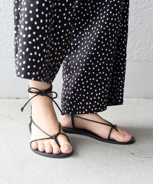 【NICOLAS LAINAS】昨シーズンからのトレンドであるレースアップデザインのサンダル。ラフに履ける様にフラットタイプをセレクトしました。パンツの裾の上に結び付けて履くスタイルがおすすめです。【NICOLAS LAINAS】4代続く、ギリシャアテネの老舗のシューズブランド。最高級のカーフスキンレザー、ギリシャの伝統的な技術などを用い、1つ1つ手作業で仕上げておりクオリティーやデザイン性の高いシューズ作り続けています。※サイズ換算(表記)はあくまで目安となります。※薄いボール紙を使用した箱の為、輸送中に箱が多少破損する場合がございます。予めご了承お願いいたします。※末永く愛用頂く為に、アテンションタグを必ずご確認の上、着用又はお取り扱い下さい。
