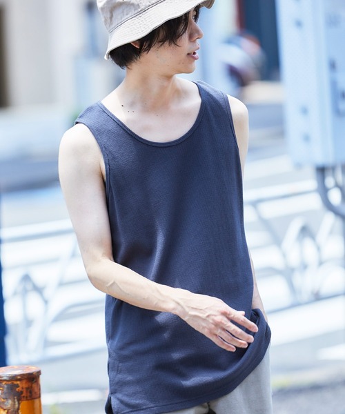 ■これからの季節にマストな1品!レイヤードスタイルに欠かせないロングタンクトップ。インナーとトップス、オールマイティーに活躍してくれる絶好のアイテム。■絶妙なオーバー感が旬なレイヤードスタイルを演出!リラックスしたシルエットと、ナチュラルなネックラインが印象的なハイスペックなタンクトップが完成。スタイリングを選ばずカジュアルからテーラードまで幅広く使えるのが嬉しいポイント。夏の一枚着としてや、シャツやジャケットの合わせはもちろん、ビックシルエットTシャツなどのインナーに着用し、裾部分からタンクトップを少し見せるスリットデザインを活かしたレイヤードスタイルがマスト。またデニム、チノ、ワイドパンツなど、あらゆるシルエットのパンツとも好相性。1枚持っておくと万能にお使い頂け重宝するカットソーアイテム。■上品な光沢感としなやかさのあるファブリック。凹凸感のある表面感が特徴の肌触り良く柔らかなワッフル素材を採用。程よい厚みと伸縮性を兼ね備え、通気性と、汗や水分を吸水し発散する速乾性をも実現。カラーはベーシックなアイボリー、ブラック、ヘザーグレーをはじめ、レイヤリングが映えるネイビー、ベージュと絶妙なカラーリングで魅せるスモークパープル, ピスタチオなど、色違いで揃えたい豊富なカラーバリエーション。毎日のワードローブの中でつい手に取ってしまうようなタンクトップをぜひ、この機会に