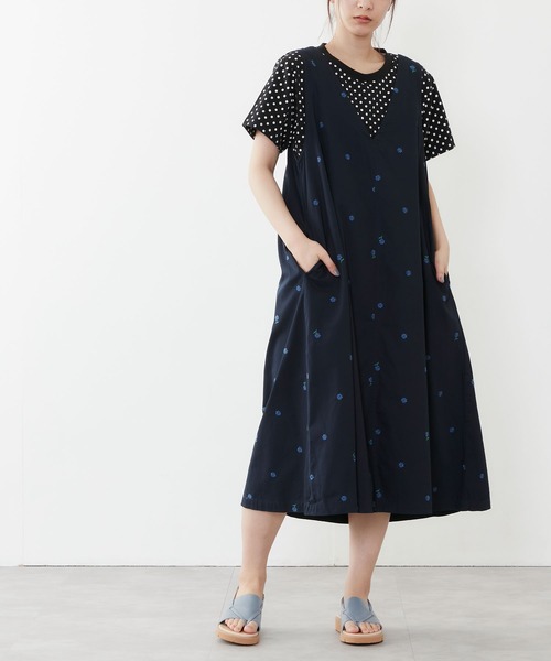 手刺繍のようなラフさのあるデイジー柄を施した、POU DOU DOUオリジナル生地のジャンパースカート。程よくハリのある綾ダンプの生地できれいなAラインのシルエットを出しています。深めのVネックで首まわりがすっきりと見えるので、子供っぽくなりすぎない印象に。気分に合わせてフロント側でリボンを結んで、インナーとのレイヤードをお楽しみいただけます。両サイドポケット付き。前後両面着用可。 POU DOU DOU プードゥドゥ ひと手間加えた存在感のある「日常着」 いつまでもときめきとかわいいを忘れない方への 愛着を持てるワードローブ