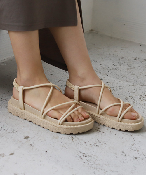 旬なアイテムを取り入れる。レースアップデザインが今っぽい。 きれいめカジュアルにピッタリな履きやすさ抜群のアイテム。 細めストラップが今っぽさありのプラットフォームサンダル。 フラットなので歩きやすく、脱ぎ履きも楽ちん。 後ろがゴムなので脱ぐ時も楽に出来ます。濡れてもOKな素材なので便利。 底も厚く、歩きやすさも抜群です。
