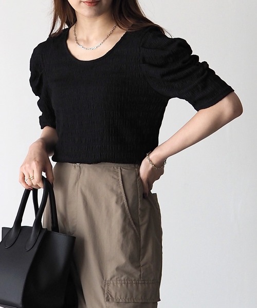 【Riberry ギャザースリーブトップス】 よそ行きにも使える、きちんと見えする袖コンシャスなカットソー ■Styling ちょっと甘めなトップスはフレアスカートで甘く着るのもいいですが、 おすすめはデニムやツイルなどのボトムと合わせてカジュアルダウンしたピリ辛なミックスコーデ。 袖のギャザーが特徴的なので、キャミワンピやサロペットのインナーにも活躍してくれます♪ ■Detail 袖のギャザーと前後の深めのUネックがレディライク。 短すぎないほど良いショート丈で、どんなボトムスとも合わせやすい1品です。 ■Material シャーリングの入ったカット素材は横伸びが良く、しゃりっとした生地感は涼しげな肌触り。 裏地:なし 透け感:淡い色はややあり 伸縮性:あり 生地の厚さ:普通 ※詳しいお手入れ方法は商品タグをご参照ください。 【Information】 ◆《お気に入り登録》がオススメ◆ ・「商品のお気に入り登録」で再入荷通知や、ラストの通知、セール通知も受け取ることが出来ます。 ・「ブランドのお気に入り登録」で新商品や再入荷など、お得な情報を受け取ることが出来ます ※撮影時のライティング、ご覧になっているモニター・PC環境により、実際の商品と色味が異なって見える場合がございます。予めご了承をお願い致します ※ご注文いただいた予約商品のお届け時期の確認は、注文履歴ページより行えます。