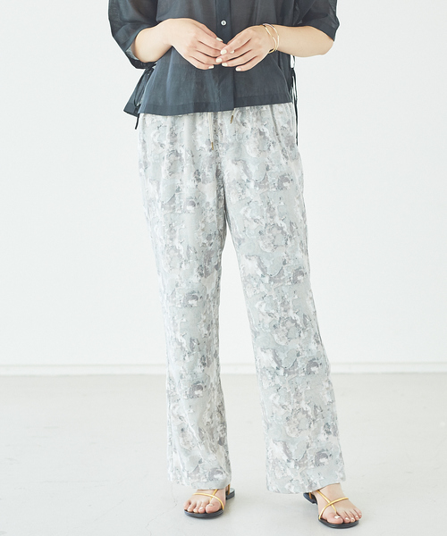 こなれ感たっぷりのリラクシーパンツコーディネートのアクセントになる新鮮なプリント柄のリラックスパンツ。さらっとした素材感でシワになりにくく、カジュアル過ぎないきれいなシルエットをキープ。ウエストはゴム仕様なので着脱も楽ちんでストレスフリーなのもポイント!リネンシャツと合わせたこなれ感のあるスタイリングや、スカートを取り入れたフェミニンな着こなしも◎グッと今っぽさのある最旬スタイリングが叶う1枚です♪【仕様】・裏地有り・ポケット無し