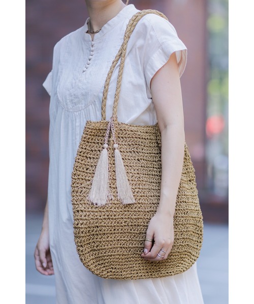 季節感のある雑材素材のバッグ・肩にもかけられる長めのハンドル・軽量で普段使いしやすいアイテム・裏地付きで内側にポケット付き【スタッフレビュー】ナチュラルな風合いの素材を使用したショルダーバッグ。ハンドルにつけたカジュアルな印象のタッセルがアクセントになります。肩掛けしやすいショルダーや、内部は裏地付きで使いやすい仕上がりです。コーディネートに馴じみよいカラーもポイントです。【取扱注意事項】こちらの商品は601-1161048と同一商品です