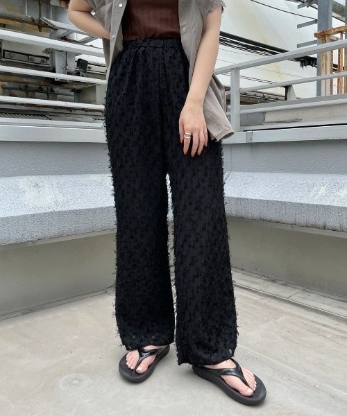 ふわっとしたフェザーデザインが目を惹く。 女性らしさたっぷりのイージーパンツ。 ・ふわっとしたフェザーデザイン ・上品な光沢感 ・ウエストゴムで履き心地抜群 【生地・デザイン】 立体感はありながらも、柔らかい印象に仕上がるイージーパンツ。ふわっとしたフェザーが特徴的なデザイン。上品な光沢感はコーデを華やかな印象に演出してくれます。ストンと落ち感の出るシルエットはワイドパンツながらも、スタイルアップ効果抜群。ウエストはゴム仕様なので、履き心地も良く、楽ちんなのに女性らしさたっぷりなのも嬉しいポイントです。さらっとした生地で、オールシーズン楽しめる重宝アイテム。 【コーディネート】 素材感のある見え感なので、シンプルなトップスでもコーデが一気に女性らしさをプラスできます。ワイドシながらも落ち感のあるシルエットなのできれいなボディーラインが出るので、カジュアルなTシャツとの相性も◎きれいめが気分の方は、デザインブラスなどで少しガーリーなアイテムをプラスするのもおすすめです。