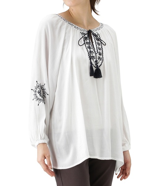 夏にぴったりの楊柳素材のブラウスです。 おしゃれなエスニック調デザインに袖と襟刳りの刺繍がポイント。 カラーは、ホワイトです。 柔らかい素材で肌離れがよい爽快な着心地をお楽しみいただけます。 ブラウスのボリューム感を活かすならに、スキニーなどのタイトなボトムスが好相性♪ もちろんワイドパンツやスカート合わせても可愛いです。 ■モデルサイズ 170cm B:81/ W:59/ H:83 着用サイズ:M ※商品画像は、ご覧になられているパソコン、ディスプレイ等の設定により、実際の色味とは異なる場合がございます。