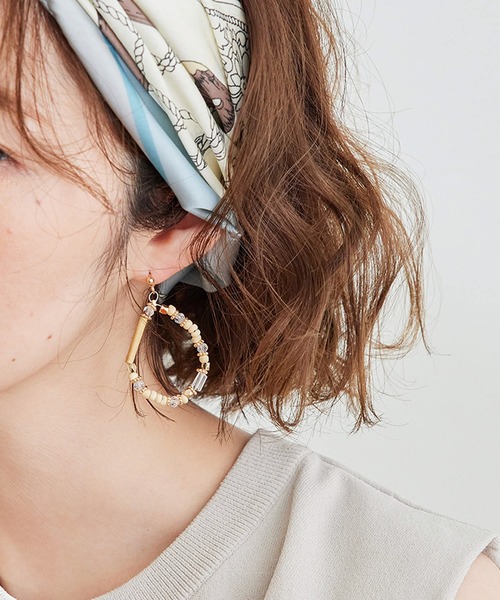 軽やかに揺れる夏らしさ満点のピアス。【デザイン・シルエット】 ・ウッド調やアクリルなど、さまざまなタイプのビーズを組み合わせたリング状のピアス。 【カラー】 ・ベージュ系のみの展開。 【スタイリングポイント】 ・リゾート感溢れるプリントワンピースに合わせると爽やかな印象に。 ※撮影時の光、お使いのモニター環境によって色の見え方が違う場合がございます。
