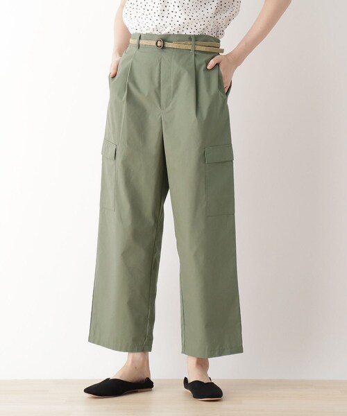 【デザイン】 リラックス感がありつつ、ゆるすぎない絶妙な雰囲気のカーゴパンツです。 大人カジュアルにピッタリなアイテムです。 ゴムでのびる雑材風のベルト付きなので、 トップスをインしたときも決まりやすいデザインです。 ※ポケット数:横×2、カーゴポケット×2 【生地感】 ハリのあるサラッとした風合いです。 ※裏地なし モデル情報:身長170cm B80 W59 H85 着用サイズ:02(M) 店舗へのお問い合わせ商品番号:741-62040 ●製品寸法: 02(M):W66~74cm H86cm 股下64cm 前股上33cm 渡り幅33cm 裾幅23cm 付属ベルト全長106cm 付属ベルト幅1cm 03(L):W68~76cm H88cm 股下65cm 前股上33cm 渡り幅34cm 裾幅24cm 付属ベルト全長108cm 付属ベルト幅1cm 04(LL):W70~78cm H90cm 股下67cm 前股上34cm 渡り幅35cm 裾幅25cm 付属ベルト全長111cm 付属ベルト幅1cm 備考: