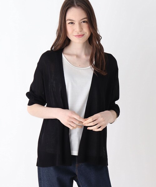 【デザイン】無造作に羽織ってもサマになるカーディガンです。お家でお洗濯できるマシンウォシャブル機能も嬉しいポイントです。薄くて軽く、バッグに入れて持ち歩いたり、オフィスに常備しておいたりと大活躍です。【生地感】ソフトでサラッとした肌ざわりで、暑い夏も快適な着心地です。※こちらの商品はやや透け感があります。【サイズ】大きいサイズ(LL)の展開あり。※04(LL)サイズはWEB限定サイズです。モデル情報:身長166cm B80 W59 H86 着用サイズ:02(M)店舗へのお問い合わせ商品番号:741-32014●製品寸法:02(M):着丈55cm B106cm 袖丈41cm 肩幅44cm03(L):着丈55cm B112cm 袖丈42cm 肩幅46cm04(LL):着丈56cm B118cm 袖丈43cm 肩幅48cm備考:
