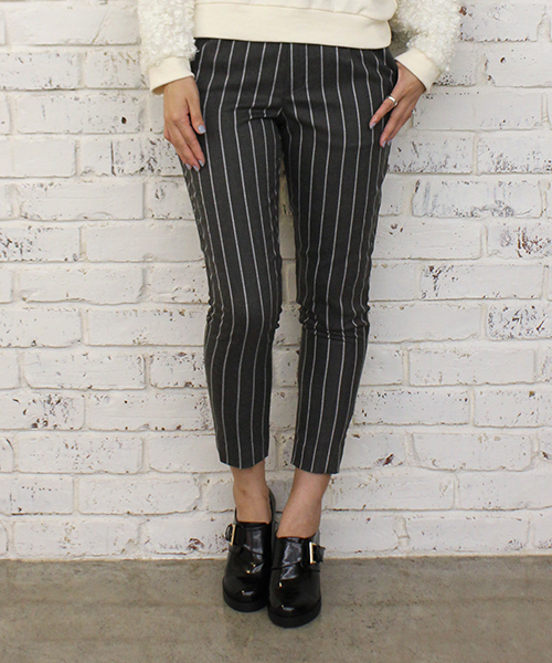mystic(ミスティック) ストライプ柄のテーパードパンツ。程よくルーズなシルエットでバランス良く履いて頂けます。足元はヒールのパンプスや、スニーカーであえてカジュアルに合わせるのもお勧め。 オンにもオフにも使えるアイテムです。