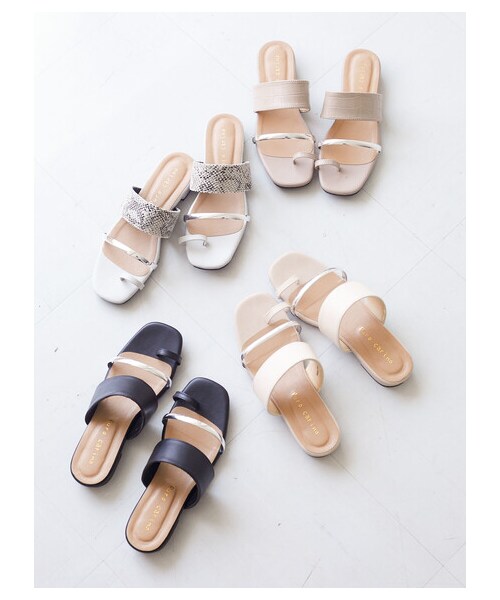 艶めくメタリックラインがアクセントに映えるサンダル。 サムホールと甲を包む太幅なベルトで安定感があり、歩きやすいのも嬉しいポイントです。 パンツやスカートなど、どんなボトムスともバランスよくスタイリング出来る1足。