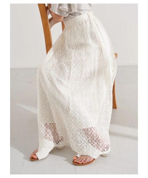 取り入れるだけで女性らしい着こなしに導くスカート。 繊細な表情をみせるレース素材が、美しいシアー感を演出します。 ほどよくフレアなシルエットで柔らかなムードをプラス。 きれいめにはもちろん、カジュアルアイテムとも相性よく着られる1枚です。