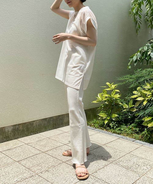\旬な着こなしが楽しめるセットアイテム/コーディネートいらずのお得なセットアップ。リラクシーな着心地ながらも、どこか上品な印象を与えてくれるアイテムです。トップスは身体に張り付かず さらりと着て頂ける上品なシアー素材に。お袖は安心感抜群のフレンチ袖仕上げることで、さりげなく二の腕部分をカバーしてくれます。パンツは、縦ラインを強調してくれるリブ素材。伸縮性のある生地と、ウエストの全ゴム仕様でストレスのない履き心地を叶えてくれます。セットアップではありますが、上下別々でも大活躍してくれるので、このアイテムを抑えておけば、着こなしの幅がぐっと広がりますよ。*********************・嬉しいセットアイテム・上下別でも大活躍・リラクシーな着心地なのに上品な雰囲気!*********************【 ♥ をクリックでお得な情報をお知らせいたします 】〈 商品のお気に入り登録 〉 お気に入りアイテムのお値下げ・再入荷・在庫ラスト1点など通知を受けることができます。〈 ブランドのお気に入り登録 〉DOUDOUの新商品や再入荷、セール、クーポン配布などお得な情報を受けることができます。--------------------------------------※ 掲載画像の商品の色味は、 撮影場所や光の当たり具合などにより色味が異なって見える場合がございます。 また、お客様のお使いのPC・スマートフォン等のモニター環境などにより色味が異なって見える場合がございます。予めご了承の上ご注文ください。 ※着用、お取り扱いの際は、商品についている品質表示とアテンションタグを必ずご確認下さい。