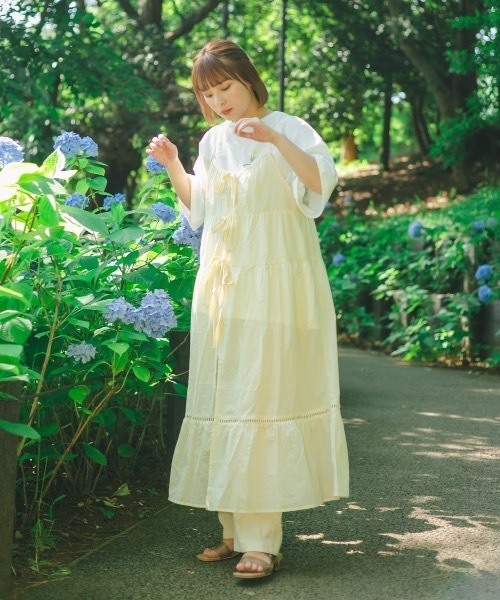 \ scene / きょうはだいすきなお花屋さんでアルバイト。 水やりはまいにちかかさずにね カラフルなお花とゆらゆらと揺れる木々 かすかに夏を知らせる香りがする あじさい色の自転車を押しながら 帰りはちょっぴり遠回りをしたいキブン。 あしたはどんなおはなが咲くのかな? ▼point 透け感のあるキャミワンピースは、夏のレイヤードスタイルに欠かせないアイテム♡ なんと2WEY仕様なので、コーデの着回しもたくさん楽しめる万能ワンピースです。 レースのあしらいが女の子らしい1枚♡ リボンを前にしてガーリーに、リボンが後ろの時は大人っぽく着こなせるデザインに。バックスタイルもとっても可愛くなります♡ ふんわり広がるデザインなので、暑い時期も暑苦しくなく、オシャレを楽しめます♪ ▼coordinate ハイネックメロウトップス(NM1002)と合わせてこなれカーリーに。 Tシャツとの着こなしもカジュアルガーリーになっておすすめ♡ ▼fabric 透け感のあるやわらかい生地で、重ね着していないような軽い着心地。 ------------------------------- 透け感:あり 裏地:なし 生地の厚さ:やや薄め 伸縮性:なし 光沢感:なし ------------------------------- ▼スタッフが着用してみました! 身長:156cm/普段着用サイズ:M 今回着用サイズ F 【着用感】密着感は無いので、重ね着するのにちょうど良い着心地。低身長さんも高身長さんも着こなせる長さになっています。 -nemneブランドコンセプト-古着女子プロデュースブランド【nemne】"背伸びはしない ありのままでのびのびと きょうのわたしが きのうのわたしのおきにいりになるように とっておきのねんね" ※サイト上のカラー名と、お届け商品に記載されているカラー名が異なる場合がございます。 ※ご覧のモニター環境により、画像の色味と多少異なる場合がございます。 ※ご注文いただいた予約商品のお届け時期の確認は、注文履歴ページより行えます。 ★《お気に入り登録》でお得な情報がいっぱい★・「商品のお気に入り登録」で再入荷通知や、ラストの通知、セール通知も受け取ることができます。・「ブランドのお気に入り登録」で新商品や再入荷など、お得な情報を受け取ることができます!