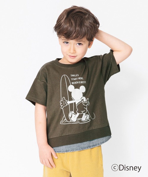 裾にブリーチデニムをあしらい重ね着風にすることで、おでかけにも普段遣いにも大活躍する1枚です。ボードにもたれながら海を眺めているミッキーのプリントと、ヴィンテージ感のあるボディ加工でおしゃれなレトロサーフィンのイメージをプラスしています。