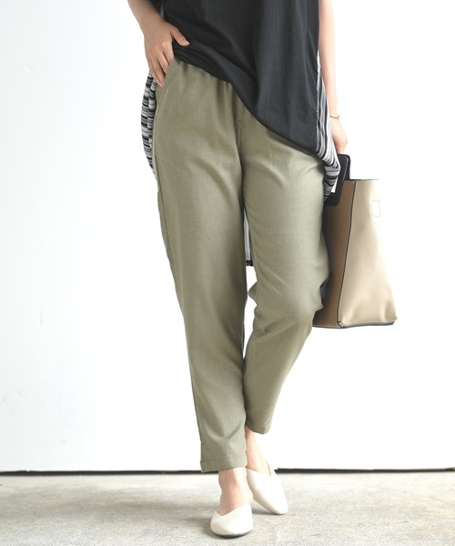 人気の【マムパンツ】が爽やか素材で登場!フリルのウエストが可愛いマムパンツがコットンリネンブレンドで登場。柔らかなコットンとさらっとしたリネンが涼しげなボトムスです。レーヨンもミックスしてあるので適度な落ち感のあるしなやかなシルエットも魅力。見た目にも爽やかなパンツが季節感のある装いを演出してくれます。ハイウエストなので脚長効果も◎。ヒップやお腹周りにゆとりがあるので体型カバーもしてくれます。夏のワードローブにあると便利な1枚♪※オールシーズン使えるマムパンツはこちらラップウエストデニムマムパンツ(1241100036)裏地なし伸縮性なし薄手前開きファスナー・ボタン留めウエストゴム仕様ベルトループありサイド・ヒップポケットあり織キズやだま等は生地の特質です色落の可能性もございます(しばらくは単独でお洗濯してください・白系のお洋服や小物類等一緒にご着用されますと色移りする場合がございます)洗濯:手洗い可