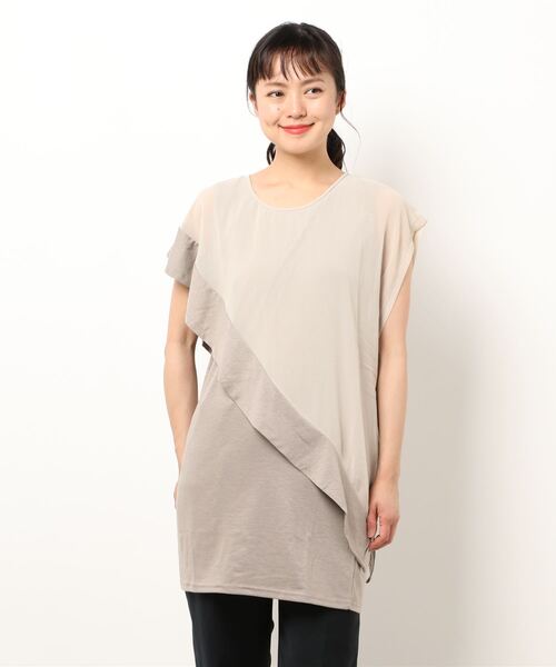 シフォン素材斜めラインが印象的*レイヤードチュニック ヒップも隠れる安心丈。着心地の良い素材使い。 ウエストがすっきり見えるバランスのアシンメトリーなデザイン。 お手入れ:※ご家庭でのお洗濯、手洗い、ドライクリーニングができます。