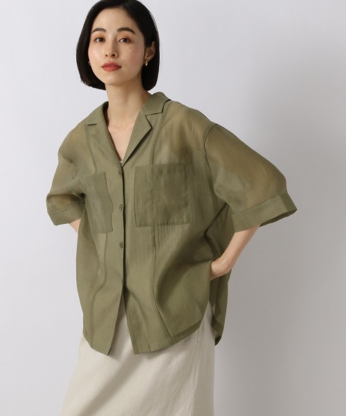 透け感のあるオーガンジー素材を使用したショート丈シャツ。前身頃と袖に切替を入れて立体感のあるシルエットに仕上がるようにしました。シャツとしても羽織としてもお使いいただけます。 柄のニットタンクなどをインナーに着用するのがおすすめ。前ボタンは開けてインナーを見せたスタイリングだとこなれ感のある着こなしが完成します。光沢感のある素材なので、合わせるボトムスは麻混など天然系パンツと合わせるとバランス良く着こなせます。