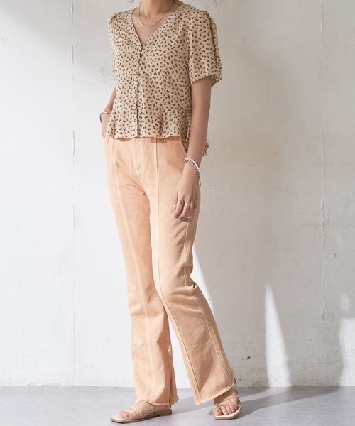 今年トレンドのカラーツイルフレアパンツ。製品染めとバイオ加工を施した、リメイクしたような風合いが特徴のパンツ。膝下から緩やかに広がるフレアラインに、裾のスリットが抜け感をプラス。フロントに入れたセンターラインが、美しいシルエットを叶えます。カジュアルからフェミニンまで、シーズンを通してご活躍頂けるアイテム。夏の着こなしに映えるカラーデザインが、鮮度溢れるスタイルを演出します♪***********************洗濯方法:家庭洗濯可裏地:なし透け感:なし伸縮性:なし光沢感:なし生地の厚さ:普通***********************お取り扱いの注意点・当該製品はASUTEX(R)※染料を使用した製品染めの商品です。ASUTEX(R)染料は独特のビンテージ感を生み出す一方で、 液体洗剤(原液)がかかると変色する事がありますので、お洗濯の際には洗剤が直接かからないようご注意下さい。・製品染めの商品となっておりますので洗濯により色落ちします。他の物と分けてお洗い下さい。・製品を裏返しして洗うことで元々の生地の色合いが長持ちします。※ASUTEX(R)(アステックス(R))スペインのASUTEX社が開発した極限まで汚水を出さないエコ染料として注目を集める染料。既に欧米諸国では注目されており、アジアでは数社しか取り扱えない染色技法として、アパレル市場においても注目を集める存在となっています。エコ染料としてのみならず、顔料染め、硫化染め、反応染めとも違った独特の目を引く色合いも大きな特徴です。※ご覧のモニター環境や撮影環境により実際の商品と多少色味が異なって見える場合がございます。【お気に入り登録がオススメ!】●商品のお気に入り登録「在庫残りわずか」の通知や、「完売カラーの再入荷」、「セール」の通知を受けることができます。●ブランドのお気に入り登録新商品や再入荷等、ブランドのお得な情報を受け取る事が出来ます。
