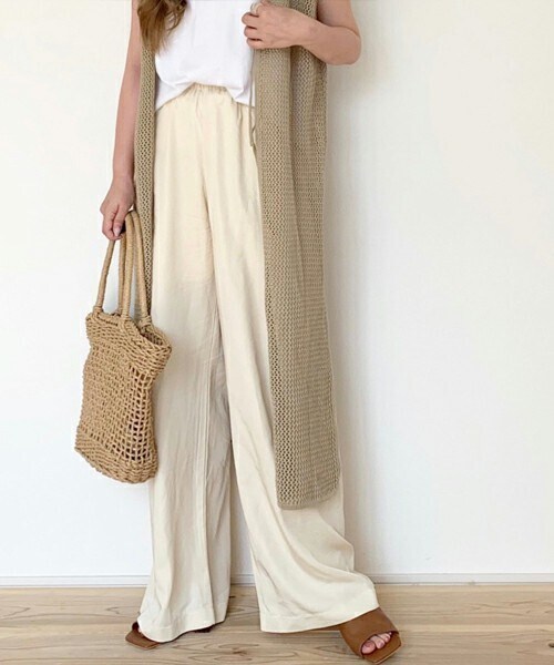 ウエストゴムでゆったり履けるワイドパンツ。 てろんとした落ち感のある生地なのでシンプルに合わせても カジュアルすぎずおしゃれに履いていただけます◎