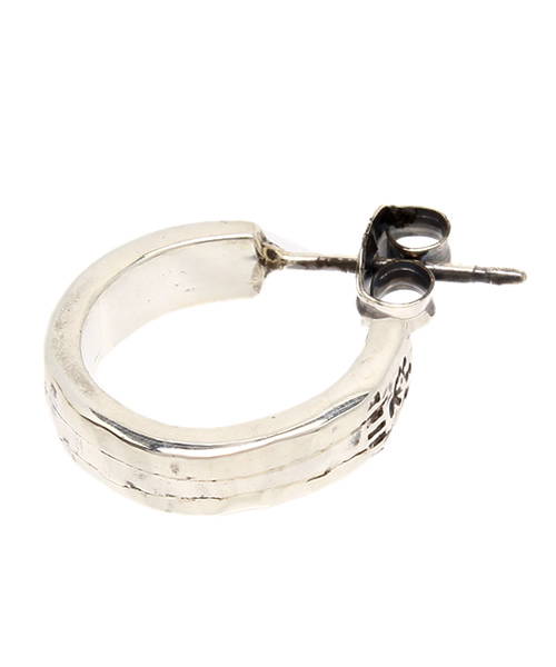 一見シンプルなハンマーで叩いた細身のピアスですが、実はシルバー925製のボディの中央に1本の純銀線が埋め込まれていて、着用してるうちに変色してきたり劣化してくると、ストライプが浮かびあがってきます。 そのストライプを銀磨き布等で拭いたり、磨き直すと又、シンプルな銀塊にもどる。 あえて同系色の素材でストライプを表現したさりげなさがポイントの変化が楽しめるピアスです。