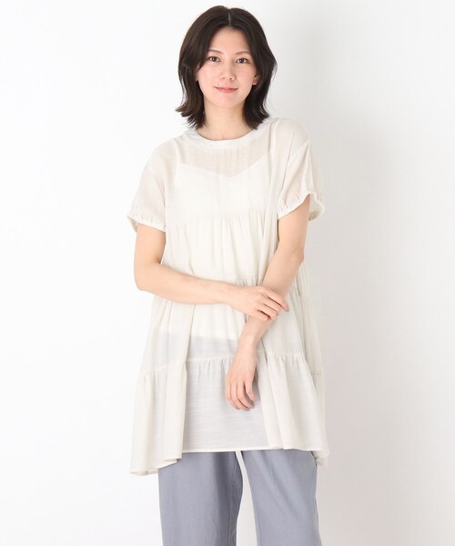 【デザイン】ギャザーを取り入れたティアードのふんわりブラウス。バックリボンつきなので、ガーリーな雰囲気を演出してくれます。ワンピースのようなチュニック丈なので合わせるボトムによって色々なスタイリングも楽しめるのが◎です。【生地感】夏らしい清涼感のあるスラブが着心地の良さを後押ししてくれます。※こちらのアイテムは透け感があるため、インナーの着用をおすすめします。【サイズ】大きいサイズ(LL)の展開あり。※04(LL)サイズはWEB限定サイズです。モデル情報:身長167cm B78 W62 H88 着用サイズ:02(M)店舗へのお問い合わせ商品番号:C62-82073●製品寸法:02(M):着丈76cm B96cm 袖丈14cm 肩幅45cm03(L):着丈78cm B97cm 袖丈14cm 肩幅45cm04(LL):着丈81cm B98cm 袖丈15cm 肩幅45cm備考: