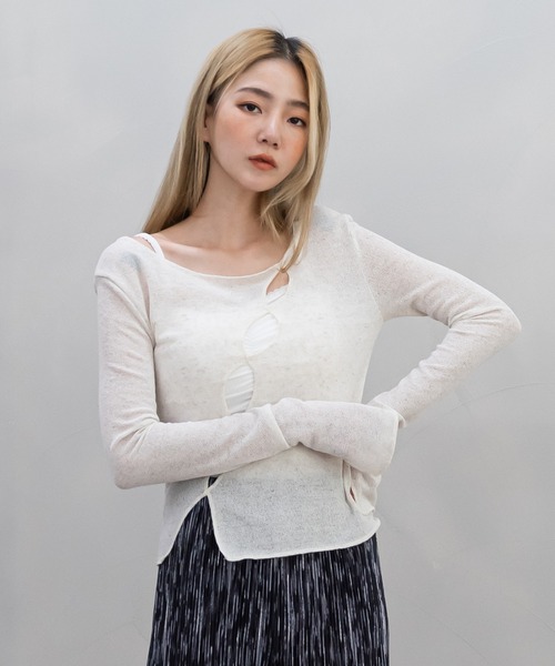ユニークな斜めホールスリム長袖TシャツがUNE MANSIONから登場!袖にスリットがあり、ネックラインから斜めに落ちるホールディテールが魅力のあるアイテムで、薄い素材で製作されており夏に着用しても涼しく着られるアイテム!レイヤードコーデで活用度が高く、スリムに付いたラインがボディラインをよりスリムに見せてくれます。短いインナートップアイテムと一緒にマッチしやすく、様々なスタイリングができるアイテムです!アイボリー、チャコール、ブラックの3色をぜひUNE MANSIONにてチェックしてみて下さい!インナーはコーディネート用の商品となりますので、別途の購入が必要となります。※ご覧のモニター環境や撮影環境により実際の商品と多少色味が異なって見える場合がございます。ご理解の程よろしくお願いいたします。もっとお買い物を楽しむために!商品のお気に入り登録お気に入りの商品やサイズ・カラーまで、お気に入りの登録をしていただきますと、そのアイテムのセールの通知、ラスト1点になった時の通知や、完売しても再入荷通知を受け取ることができます!ブランドのお気に入り登録新商品の発売や再入荷、タイムセールやクーポン発行のお知らせなど、UNE MANSIONがお届けするお得な情報を受け取ることができます!※通知はアプリでも受け取ることができますので、是非アプリの通知設定をお願い致します!