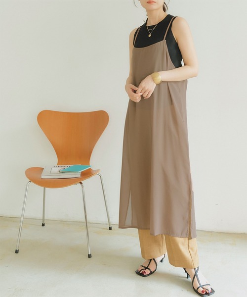 Tシャツやタンクトップとレイヤードしてトレンド感を楽しめるシアーワンピース。・上品な透け感が大人のトレンドスタイルをメイク。・細めのダブルストラップで華奢感を演出。・程よくゆとりのあるシルエットでストレスフリーな着心地。※当商品は機械による生産の過程上、どうしても"生地を織る際の糸の継ぎ目"や多少の"ほつれ"、他繊維の"混紡"、また、形やサイズや柄に多少の"誤差"が生じる場合がございます。※サイズは、実寸サイズを測っているため多少誤差がでる場合があります。製造工程の関係上、各採寸箇所実寸(平置き)より【約-3cm~+3cm】程度は誤差の許容範囲とさせて頂いておりますので、予めご了承くださいませ。※メーカーより密封状態で入庫し、検品時に再度袋詰めを行っておりますが、素材により染料等の臭いが強い場合がございます。※発送上の状態によって商品がシワになる場合がございます。※商品により色落ち・色移りがある場合がございますので、品質表示をご確認の上、お取り扱いにご注意くださいませ。【生地】柔らかい薄手生地【伸縮性】なし【透け感】あり【裏地】なし