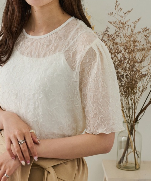ナチュラルな風合いが魅力のハーフスリーブシアーブラウス。表情豊かな凹凸が今年らしい雰囲気のあるスタイリングに。程よいシアー感が大人の抜け感を演出。夏らしい軽やかな素材は、着心地もさわやかです。着るだけでパッと華やぐ大人のシアートップス。■point・柔らかな素材とシアー感が魅力的なトップス・エアリー&立体感ある美しいくしゅくしゅシワ加工・ボトムスを選ばない幅広くアレンジ可能■detail透け感でさりげなく肌魅せできるシースルー素材は、注目のマストアイテムです。スッキリ見えるラウンドネックとぽわんと膨らんだ肩のデザインが、エレガントな大人っぽさと抜け感をプラス。■fabric生地の凹凸により肌への接地面が少なくなるため春夏にぴったりの素材。……………………透け感:あり厚さ:薄手伸縮性:なし……………………■coordinateその日の気分に合わせてお持ちのインナーと合わせることもできるので、コーデのバリエーションが広がります。どんなボトムにも合わせやすく、インスタイルでもアウトスタイルでも着ていただけます。※ご注意※・屋外の光や照明の当たり具合で、実際の商品の色味とカラー別画像の色味に若干の違いが発生する場合がございます。・詳細画像と併せてご確認の上、ご注文いただきますようお願い致します。※サイトに表示されているカラー名と実際のお届け商品に記載されているカラー名が異なる場合がございます。●お買い物をお得によりお楽しみいただく為に●▼商品のお気に入り登録&ブランドお気に入り登録▼ がおすすめです!♡をクリック完売カラーの再入荷通知や、ラスト1点の通知、プライスダウンしたセール通知も受け取ることができます。ブランドお気に入り登録もご一緒にお願い致します。#ニュアンスカラー#淡色#淡いカラー#楊柳#クリンクル