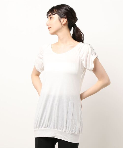 肩に走るビジューラインがシンプルコーデのアクセントに!大人度を一層引き立てる一枚。この季節、何枚あっても困らないカットソー。ほんのり光沢のあるしっかり生地。大人が着るに相応しいほんのりの光沢を感じるカット素材。ほどよいストレッチが効いているので着心地楽チン!お手入れ: 手洗いしてください。