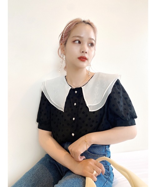 首元のダブルフリルと花柄デザインが特徴的なブラウス。シアー素材のフリルが抜け感を演出し涼しげな印象に見せてくれる一枚。パールボタンが上品さをプラスしてくれるので普段使いはもちろん、幅広い場面で着用できるアイテムです。
