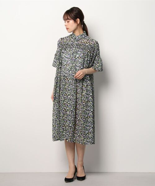 シャーリング使いとふんわりしたシルエットがフェミニンな印象の大人ワンピース。ゆったりしたサイズ感で、楽な着心地。ボタンを開けて羽織りとして着るのもおすすめです。ベーシックなドット柄と華やかなフラワー柄でのご用意です。