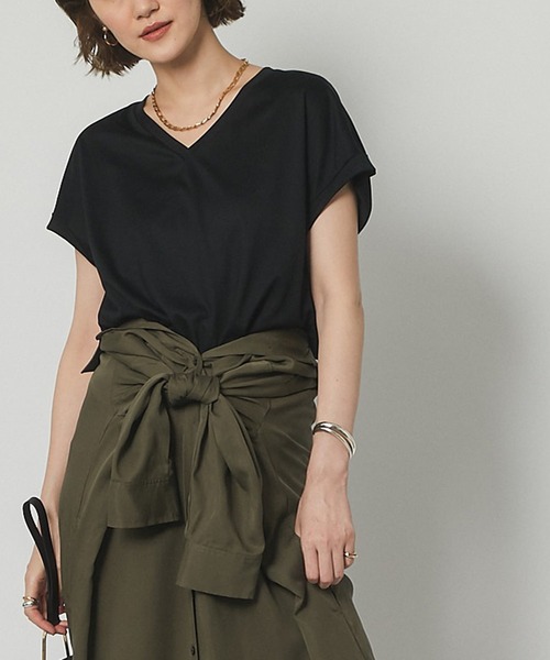 デイリーユースにぴったりな優秀フレンチスリーブカットソー ●デザイン デコルテがキレイにみえるVネックで、カットソーながらコーディネートを上品に格上げしてくれます。 ベーシックで使いやすく、シンプルなデザインで、インナーとしても優秀なアイテム。 一枚で着てもゆったりめのフォルムが華奢見えを叶えてくれ、程よい光沢と落ち感のある素材で、カジュアル過ぎずオンオフ着ていただけます。 また、レイヤードすることでシーズンレスで長く楽しめるので、色違いで持ちたくなるおすすめの一枚です。 ●おすすめコーディネート パンツ、スカートどちらのボトムスも好相性で、気兼ねなく着用することができます。 ジャケットやカーディガンの羽織り物インナーとしても、すんなりとコーデに溶け込んでくれます。 ●素材 ポリエステル46% 再生繊維(リヨセル)38% コットン16% ・サラッと快適に、扱いも簡単かつ風合いを長く保ちながら着用できる素材 ・吸水速乾とUVカットの嬉しい機能つき 洗濯方法:手洗い 裏地:なし 透け感:オフホワイトのみややあり 伸縮性:なし 生地の厚さ:普通 光沢:ややあり 【スタッフ着用コメント】 《アカネ》 身長:155cm/細身/普段サイズ:S/着用サイズ:F サイズ感:腰ぐらいの丈感で、インアウトしやすいです。 素材感:オフホワイトは少し透け感あります。吸水速乾とUVカット機能付きです。 着心地:サラッとしていてお肌に優しい肌触りです。 《natsu》 身長:153cm/普通/普段着用:S/着用サイズ:F サイズ感:腰より少し下の丈で、バランスよかったです。 素材感:肌触りが滑らかで柔らかいです。 着心地:サラっとしていて、とても涼しいです。 ============================== 【注意点】 ※画像の商品は光の照射や角度、お使いのモニター環境により、 実物と色味が異なる場合がございます。 あらかじめご了承下さいませ。 ============================== 【お買い物をもっと便利に楽しく♪】 『♡』をクリックでお気に入り登録 ・「商品のお気に入り登録」で・・・ ラスト1点や再入荷の通知が届きます。 登録して頂いた商品だけが対象となる、あなただけのタイムセールが開催されることも! ・「ブランドのお気に入り登録」で・・・ 新商品や再入荷など、いち早くブランドのお得な情報を受け取ることができますので、ご登録をおすすめします! ==============================