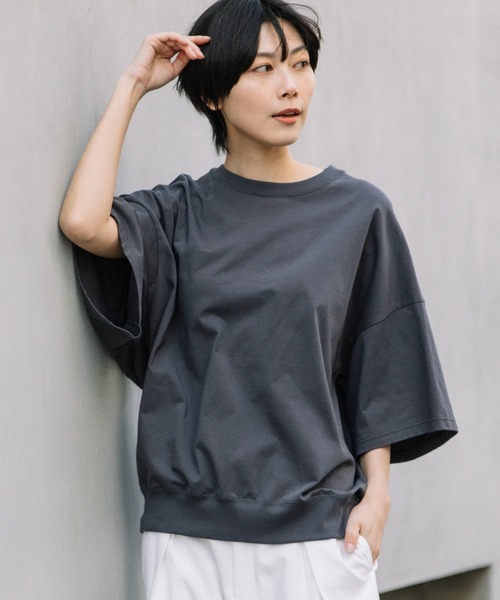 □ 2023 SPRING & SUMMER COLLECTION □◆立体的なシルエットや素材にこだわり抜いたオトナカジュアルなトップス◆<MATERIAL>人気のカットソー(ブランド品番:MN202U10/U50)と同素材を使用しています。布帛見えするキレイめな素材感でお馴染みの47/2サイロプレミアム天竺です。強撚タッチに撚糸して、ガス焼き加工による毛羽の少なさが特徴です。普通の綿素材では表現しにくい適度なハリ感と落ち感があり、シルクの様な軋み感も持ち合わせています。着用や洗濯を繰り返しても、風合いを損ないにくいのもこの素材の特徴です。<DESIGN>布帛のような素材感を、あえてスウェットのようなカジュアルなアイテムに落とし込みました。ゆるっとしたサイズ感ですが、裾はフライス素材でキュッと伸ばし付けしています。さらに後ろ裾にのみ、2か所のタックを入れて、立体感とふんわり丸みのあるシルエットに仕上げています。袖は太めのヒジが隠れるくらいの大人袖にしているので、立ち上がりのまだ暑い時期から着用出来るのが嬉しいポイントです。衿ぐりと裾のフライスは振りステッチにする事で、カジュアルな雰囲気に合わせ、細かいディティールにもこだわりました。絶妙な着丈で、パンツでもスカートでもボトムスを選ばずコーデしやすいトップスです。<COLOR>■ホワイト:Tシャツといったら清涼感のあるホワイト。レイヤードしやすい重宝なカラーで、デイリーに活躍してくれるカラーです。■ブラック:べーシックなブラック。レイヤードにはスタイリングを引き締め、一枚着には着やせ効果が期待できるカラーです。■ダークグレー:程よく引き締め効果があり、ヴィンテージ感のあるグレー。すっきりとした印象のカラーで、大人のスタイリングに馴染みやすいカラーです。■ライトベージュ:赤みを抑えた優しい印象の明るいベージュカラーです。ほどよく女性らしく、こなれた印象も演出できるカラーです。■キャメル:程よい彩度が優しく安心感のあるキャメル。肌馴染みが良くお顔映えのいいフェミニンなカラーです。■レッド:品のある落ち着いたトーンのダークレッド。一枚で華やぐので、コーディネートのアクセントにぴったりです。*お取扱いについては、商品についております品質表示にてご確認ください。洗濯:洗濯機使用可.............................≪INFORMATION ≫............................▼商品のお気に入り登録▼『♡』マークを押してお気に入り登録して頂いた商品は、セール開催の通知やクーポン発行などのキャンペーンなど、お得な情報をいち早く受けとる事が出来ますので、ぜひご登録ください。