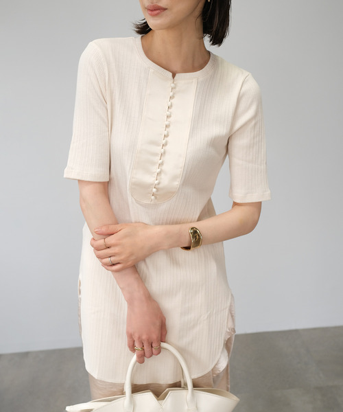 異素材ブザム切り替えがアクセントのおしゃれな1枚。 ランダムなリブ素材が表情豊かなトップス。タイトなシルエットながらも伸縮性があり着心地も抜群。5分袖デザインと前後差のある丈で自然と体型カバー◎。カジュアルすぎず女性らしい1枚。 グレイッシュベージュ=グレージュ ■コーディネートアイテム ワンピース…wz76x04979 パンツ…bf09x04924 パンツ…bf76x04605 ■商品仕様 リブ生地 裏地…なし 伸縮性…あり 透け…若干あり ポケット…なし 付属品…なし 着脱…プルオーバー ※ボタンの仕様は変更される場合がございます。 ※繊細な生地ですのでお洗濯などのお取り扱いには十分ご注意ください。詳しくはタグをご覧ください。 ※着用の際、摩擦や発汗により衣類やバッグ等に色移りの恐れ(特に淡色系のもの)がありますので、十分ご注意下さい。 【ご購入前に必ずご一読下さい】 ※モニタ環境によって、商品の色合いが多少異なる場合がございます。 ※色落ちの恐れがありますので、他のものと分けてお洗濯して下さい。 ※商品をお安く提供させて頂く為、検品後のアイロン掛けは省略させて頂いています。 発送時も簡易梱包の為、お受け取り時にたたみ皺があると思いますがご了承下さい。