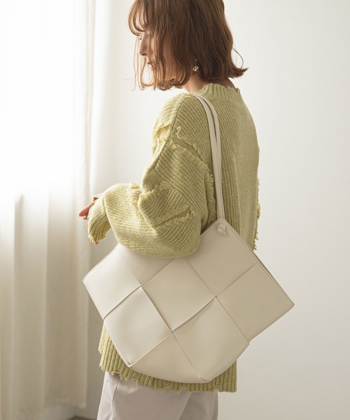 目を惹くメッシュデザインが今年らしいビッグトート 【ディティール】 ●エコレザーを編み込んだメッシュデザインは持つだけでコーデのアクセントに◎ ●小物の収納力抜群のインポーチ付き ●肩掛けしやすい長めハンドル ●ON/OFFで使いまわせるデザイン ●カジュアル~フェミニンまで幅広いテイストにマッチ ●大きく開くので使い勝手抜群!入れ口には紐が着いているのでこぼれ出る心配もありません ●金具を使わずミニマルな印象に仕上げました 【素材】 なめらかな質感が上品なエコレザーを使用。 柔らかなお色味のアイボリーと、モードな雰囲気のあるブラックの2色展開です。 【サイズ感】 ・500mlペットボトル ・タブレット ・財布、スマホ ・化粧ポーチ など日常で使うアイテムもたっぷり収納可能! 持ち手が長くがばっと開くので、マザーズバッグとしてもおすすめです。 【お買い物をよりお楽しみいただく為に】 ▼商品のお気に入り登録をおすすめします ♡をクリックしてください。 完売カラーの再入荷や、ラスト1点の通知、 セールの際の通知を受ける事ができます。 ブランドのお気に入り登録もご一緒にお願い致します。
