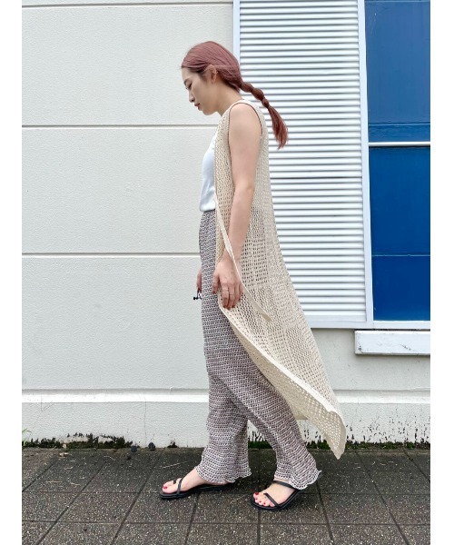 Tシャツにもブラウスにも合う、ノースリーブタイプのロングカーディガン。透かし編みで仕立てたサマーライクなデザインがポイント!シンプルなスタイリングにプラスするだけで一気にこなれ感のあるコーディネートに仕上げてくれるオススメの1着です◎-----------------------------《スタッフ着用コメント》[スタッフA]年齢 : 20代後半, 身長 : 161cm, 体型 : 普通/骨格ウェーブパーソナルカラー : ブルベ夏普段の着用サイズ : M【着用カラー/サイズ】L.KHK/FREE【サイズ感】丈感は長めで身幅もウエストのリボンで調整して頂けます。小柄さんはロング丈で合わせて頂だいても可愛いです。【素材感・着心地】ニットですが軽くチクチク感もないので着やすいです。首元がVになっているのでスッキリ見えます^^【その他】透かし編みが今年らしいニットベスト。インナーをキャミソールにしてスッキリさせるのもオススメです◎-----------------------------※この商品は、素材の特性上安定性が悪く、サイズに多少のブレがあります。※商品画像は、光の当たり具合やパソコンなどの閲覧環境により、実際の色味と異なって見える場合がございます。予めご了承ください。※商品の色味の目安は、商品単体の画像をご参照ください。▼お気に入り登録のおすすめ▼お気に入り登録商品は、マイページにて現在の価格情報や在庫状況の確認が可能です。お買い物リストの管理に是非ご利用下さい。-----------------------------透け感:あり伸縮性:ややあり裏地:なし光沢:なしポケット:なし-----------------------------