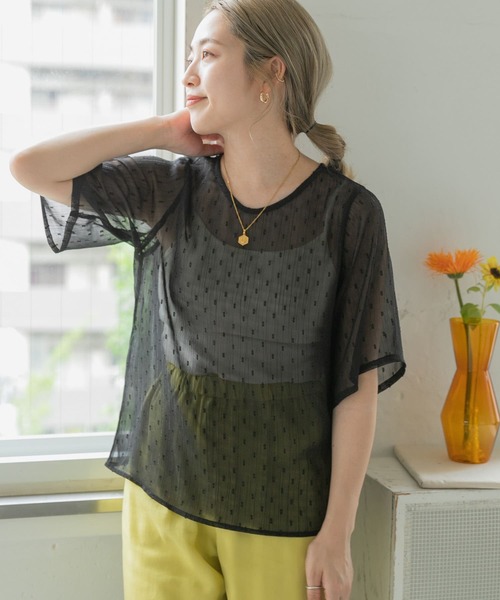 ドット×ストライプ風の柄を全体に施したシフォン生地で仕立てたプルオーバータイプのブラウス。サテン調のキャミソールをレイヤードさせた嬉しいセットアイテムです◎シーズンライクな程よい透け感がポイント!ボトムを選ばず合わせていただけ、ジャンパースカートやキャミワンピースとのレイヤードもオススメです♪ [インナー] FREE : 肩幅30cm / 総丈51cm / 身頃36.5cm / 身幅36cm ※商品画像は、光の当たり具合やパソコンなどの閲覧環境により、実際の色味と異なって見える場合がございます。予めご了承ください。 ※商品の色味の目安は、商品単体の画像をご参照ください。 ▼お気に入り登録のおすすめ▼ お気に入り登録商品は、マイページにて現在の価格情報や在庫状況の確認が可能です。 お買い物リストの管理に是非ご利用下さい。 ----------------------------- 透け感:あり 伸縮性:ややあり 裏地:なし 光沢:ややあり ポケット:なし -----------------------------