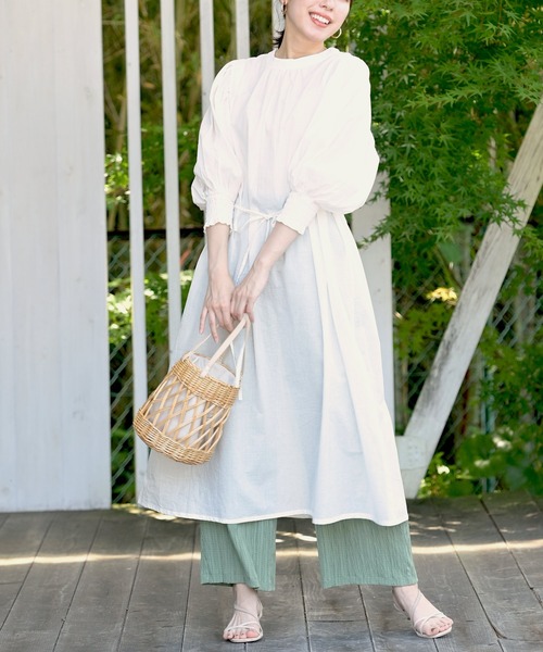 ふっくら袖が可愛い前後着用ワンピースギャザーたっぷりのふっくらとした袖が可愛らしいシャツワンピース。肩にタックをあしらったレイヤード風デザインがスタイリングを華やかに演出します。袖口はシャーリングで絞ってエレガントな手元に。ボタンを前と後ろで着られる前後着用、前を開けて羽織として、3パターンの着こなしが楽しめます。ウエストをリボンで結べばすっきりとした印象に。ふわっと柔らかでライトなコットン布帛だから着心地もご満足いただけます♪裏地なし伸縮性なし薄手前(後)開きボタン留め袖口ゴム仕様リボンベルト付き(ベルトループあり)織キズやだま等みられる場合もございます洗濯:手洗い可