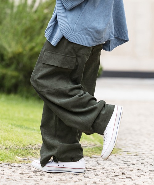 175cm B90-W73-H89 靴26.5cmのモデルがMサイズを着用。 微起毛した秋冬らしく温かみのある表面の素材を使用したワイドパンツ、裾口をフラップによるボタンアジャスターで2way仕様にすることにより「ワイドパンツ」として、更に裾口をボタンで絞ることにより「テーパードパンツ」としても着用可能な二通りの着用シルエットをお楽しみ頂けるボトムです。 ヨーロッパ古着を連想させるようなレトロ感ある素材感とカラーリングをチョイス、腿辺りのカーゴポケットもあえてマチ無しのミニマルなタイプでミリタリーな感覚を取り入れつつもミニマルに仕上げたモダンな印象で、これからの秋冬シーズンらしいニットやコート等とも好相性なキレイめなイメージの仕上がりです。 ウエストは平ゴム入りイージー仕様に仕上げていますので着用時のストレスも軽減、実用性も兼ね備えている点もこのボトムの嬉しいポイントです。 バギーボトム ※着用画像と商品単体画像で色が異なる場合がございます。 ※商品単体画像を実物により近づけております。