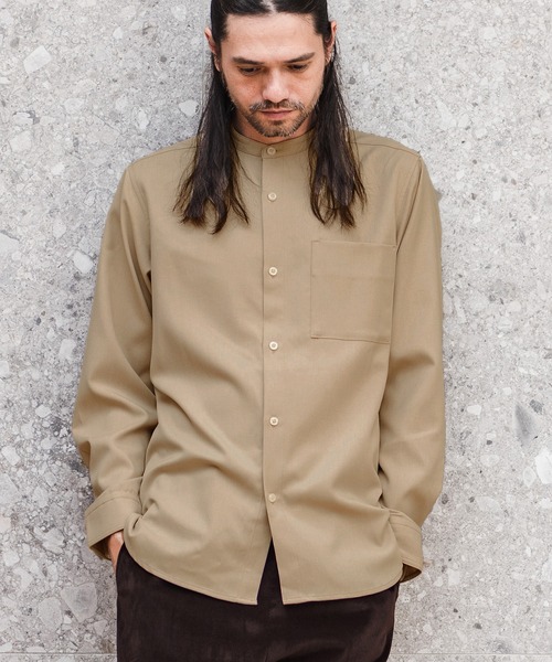 175cm B90-W73-H89 靴26.5cmのモデルがMサイズを着用。 ストレッチツイル素材を使用したバンドカラーシャツ。 ビッグシルエットまではいかないゆったりめのシルエットを採用。 バンドカラーのスッキリさとサイジングでリラックス感ある一枚。 ストレッチ素材なので着用感はノンストレス。 ※着用画像と商品単体画像で色が異なる場合がございます。 ※商品単体画像を実物により近づけております。