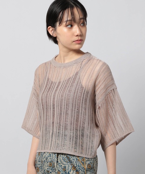 リネンライクなシャリみのあるアクリル糸を使用したニットトップス 縦縞の針抜きの編み地は程よい透け感でヘルシーな肌見せが叶う一着です。 サラッとした素材感でさっぐりとした編地が◎ キャミソールやTシャツと合わせて、合わせるインナーで幅広くスタイリングが楽しめます。 同素材のスカシアミイージーパンツと合わせてのスタイリングでよりこなれ感がUP。 ▼セットアップ対応アイテム ・スカシアミイージーパンツ(アイテム番号:958038) 〈注意事項〉 ・サンプルにて撮影をしておりますので、実際の商品とは仕様や加工・サイズ等が若干異なる場合がございます。 ・モニター・環境等により実際の商品と色味が多少異なって表示される場合がございます。予めご了承をお願いいたします。 ・撮影環境により、光の当たり具合で色味が違って見える場合があります。あらかじめご了承下さい。 ・こちらのアイテムにインナーはついておりません。