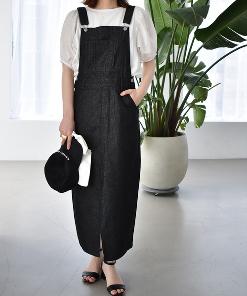 【solleim 2021SS item】 デニム素材もシルエットでレディライクに ■design フロントスリットの入ったIラインシルエットが カジュアルなデニム素材も女性らしい雰囲気に。 肩紐調節可能、サイドポケット付き。 程よいハイウエストの設定でスタイルアップ効果も。 ■material ごわつきや重さを感じにくい デニム素材を使用。 程よいハリ感はあり、シルエットをきれいに 見せてくれます。 ■styling 袖ボリュームトップスでフェミニンな印象に。 カジュアルなスニーカーとTシャツ合わせも鉄板。 金具がシルバーなので、シルバーアクセとの相性◎ ■color ブラック ※撮影時のライティングや、ご覧になっているモニター・PC環境により 実際の商品と色味が異なって見える場合がございます。