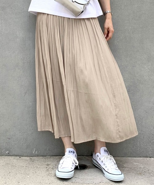 裾に向かってフェードしていくプリーツデザインが魅力的な一枚。軽やかで落ち感のあるサテン素材なのでTシャツはもちろん、秋にはトレーナーやフ―ディーなどのカジュアルなアイテムとの相性も抜群です。ウエストゴムのイージーな穿き心地なのも嬉しいポイントです。