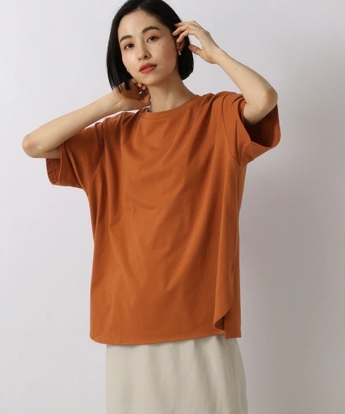 きれい目な素材を使用していて、柔らかい風合いが特徴です。 緩めのサイズ感と、前後ヘムのデザイン違いがポイント♪脇にはスリットを入れて、ボトムとレイヤード゙が決まりやすく、様々なシーンで使えるベーシックなトップスです。1枚でさらっと着用できてパンツ・スカートどちらとも相性◎