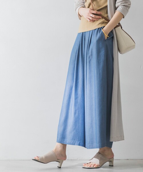【カジュアルさと上品さが両方叶う!大人のデニムアイテム】柔らかく落ち感のあるデニム素材のガウチョパンツ。さらっとした肌触りでもたつかず、ウエストゴムでストレスフリーな履き心地。上品な光沢感があるので、カジュアルでラフでありながら女性らしさも感じられるアイテム。POINT・ウエストゴムと内側の紐でサイズ調節可能・裏地なしでも透けない素材・足首が見える丈感ですっきり見えCOORDINATEシンプルなTシャツ合わせがおすすめ。スカートのようなボリューム感なのですっきりした丈感のアイテムと合わせるとバランス◎【体型別スタッフ着用レビュー】《身長:153cm/体型:小柄》丈感は足首が隠れるくらいで、シューズを選ばず合わせやすい。《身長:168cm/体型:大きめ》弁慶くらいの丈になります。どこも全く締め付けがないのでノンストレスで履けます。ゆったりなサイズ感ですがストンと下におちる素材感なので広がりが押さえられています。-----------------------------透け感 : なし伸縮性 : ややあり裏地 : なし光沢 : ややありポケット : あり-----------------------------※この商品は染色の特性上、着用中の摩擦や汗などにより他の衣類や下着、淡い色のベルトやカバン、ソファーなどに色移りすることがあるので、コーディネートや取り扱いにご注意ください。※日光や証明などに長時間当たると変退色することがあるので、高温多湿を避け光の当たらない場所で保管してください。※その他お取り扱いに関しましては、商品に付属のアテンションタグをご覧ください。※商品画像は、光の当たり具合やパソコンなどの閲覧環境により、実際の色味と異なって見える場合がございます。予めご了承ください。※商品の色味の目安は、商品単体の画像をご参照ください。