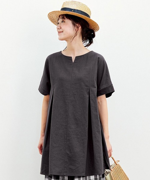 布はく切り替えできちんと着映え Tシャツの着心地で季節感たっぷりに着映える、ドッキング仕立ての涼やかなチュニック。 前身ごろは麻混の布はく、後ろ身ごろは伸びやかなカットソーでらくちん。 身ごろのタックでふんわり、からだをゆったり包む優美なシルエットが自慢。